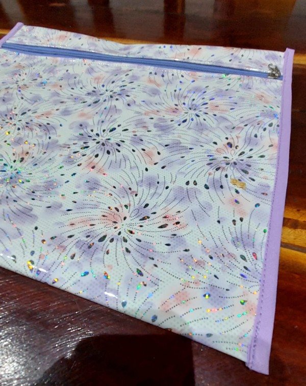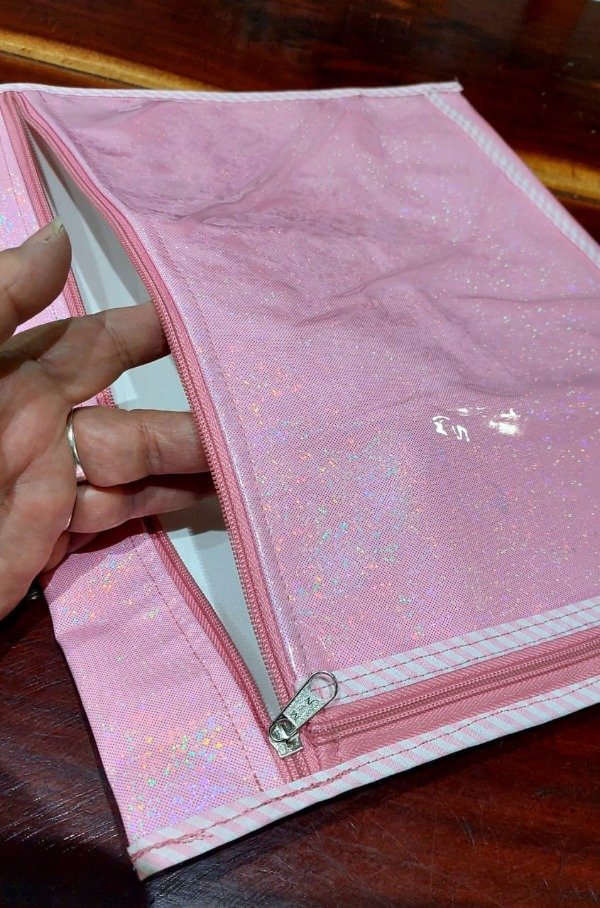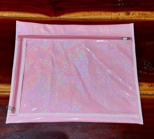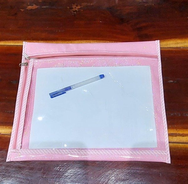 Con bolsillo al frente de nylon cristal con capacidad de hasta una hoja tamaño A4.