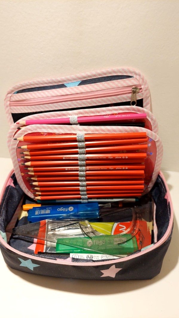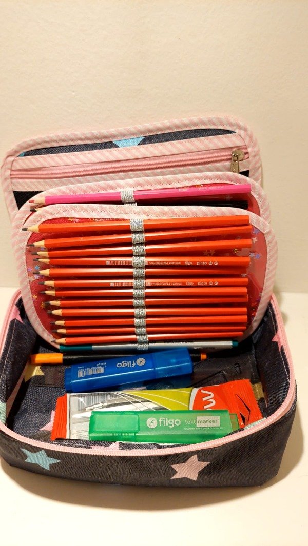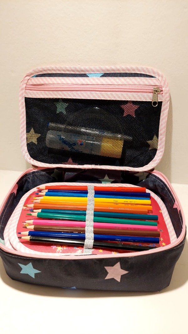Con elástico para 52 lápices, 13 en cada solapa y un bolsillo de red con cierre en la contra tapa.