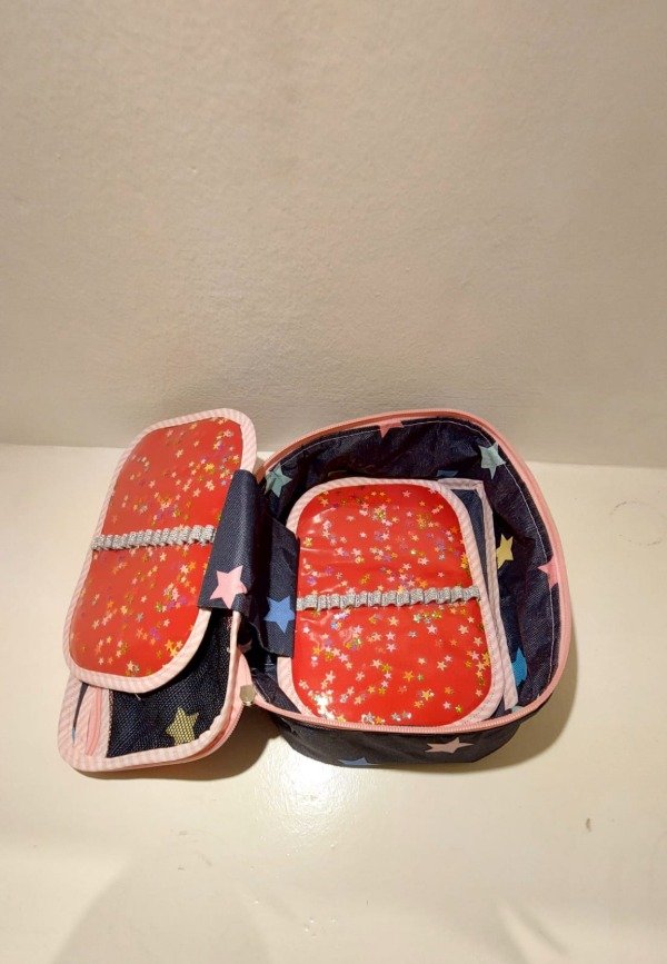 Cada solapa porta lápices forrada con nylon cristal con glitter.