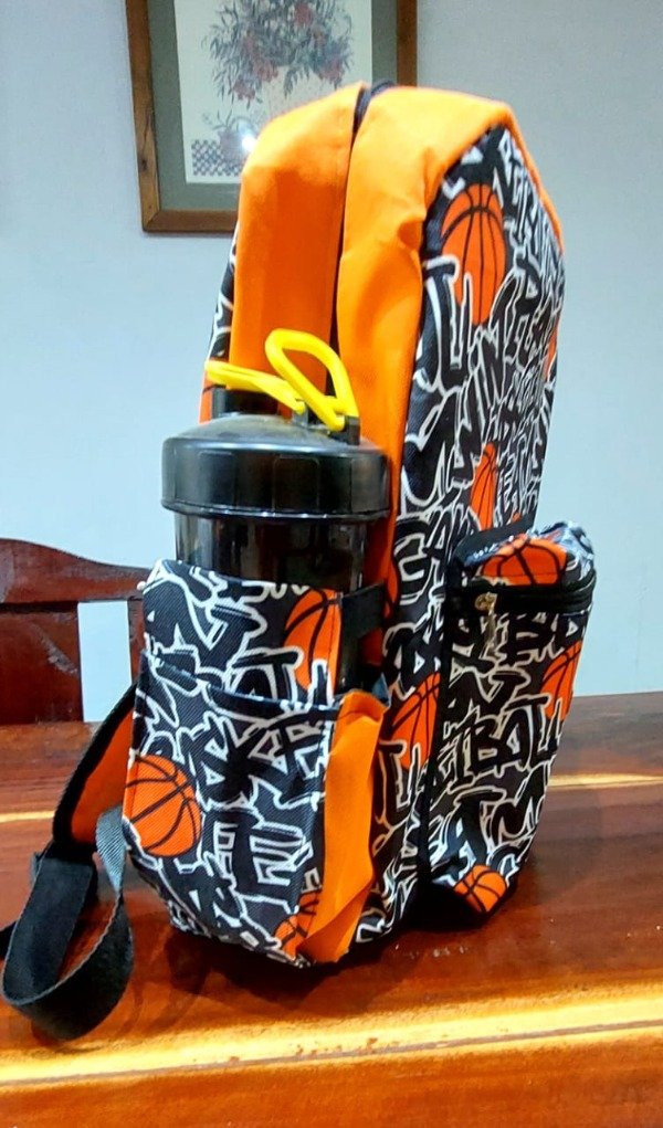 Cuenta con un bolsillo al frente con cierre, uno interior sin cierre y dos porta botellas a cada uno de sus lados.