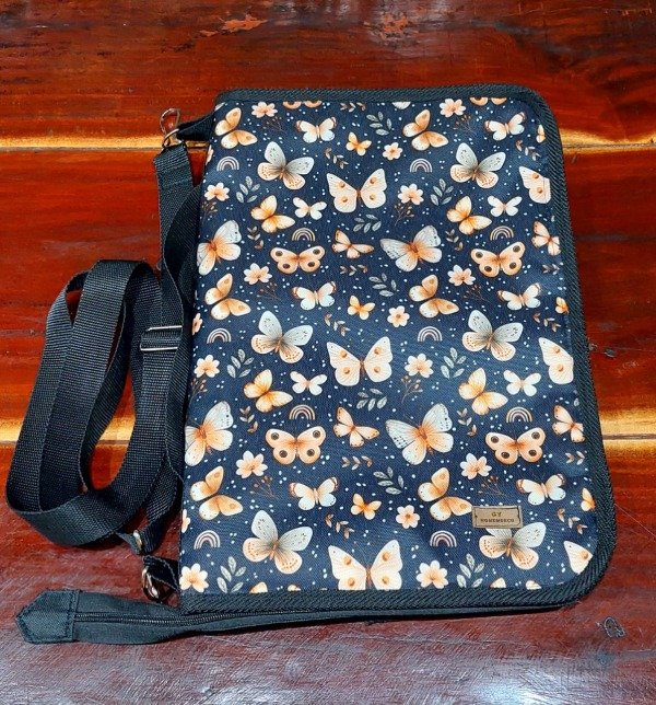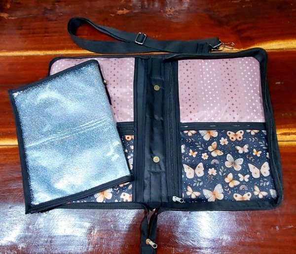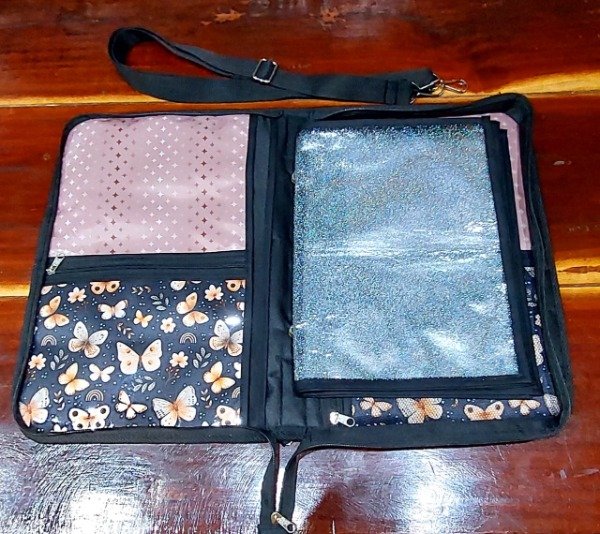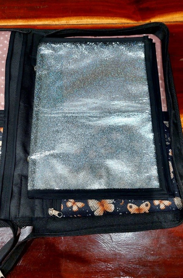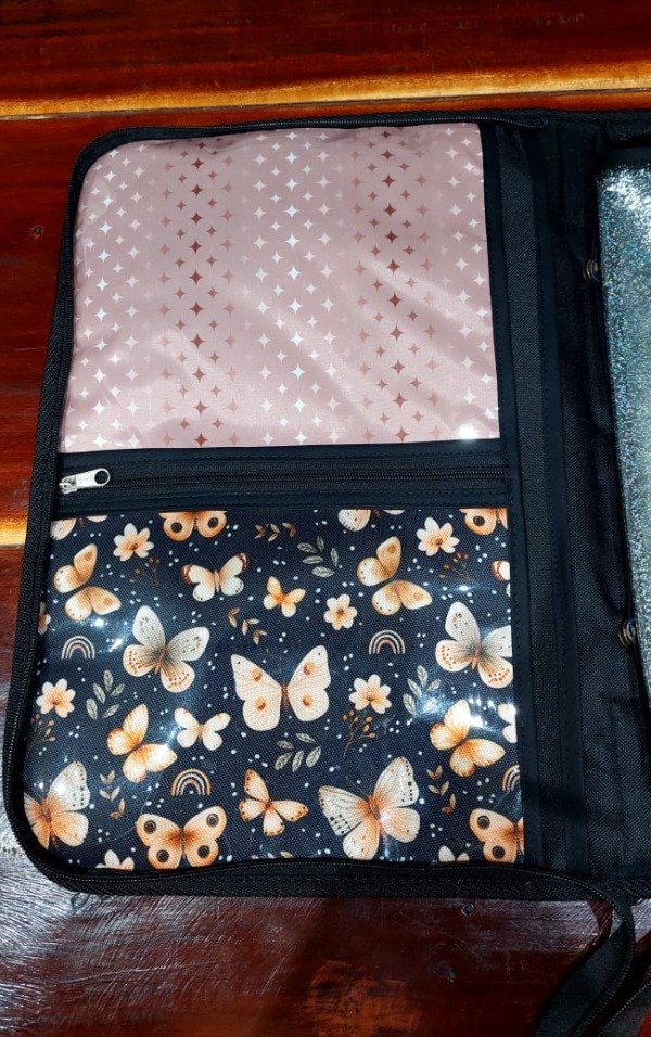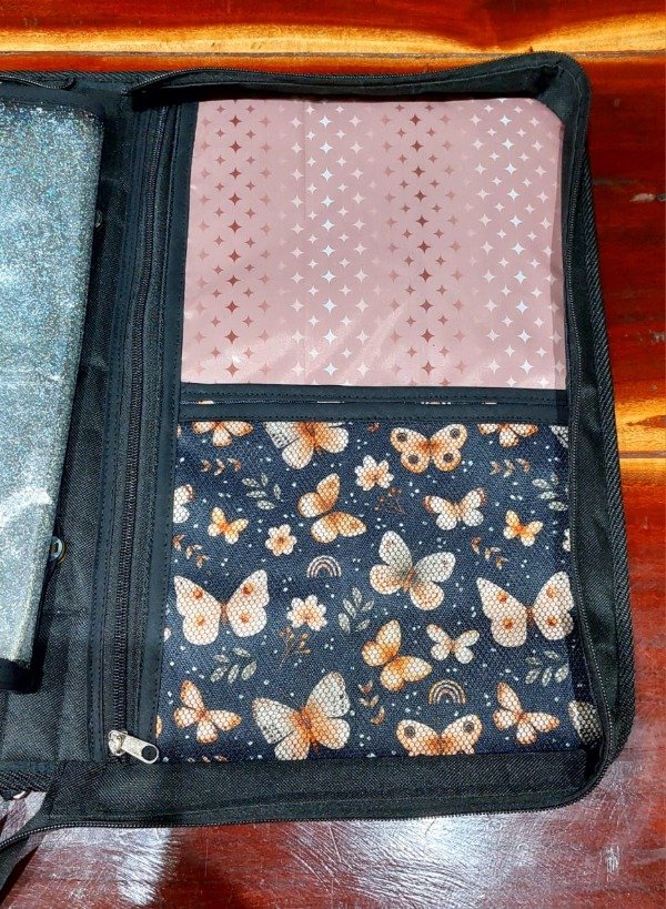 De un lado 2 divisiones grandes y 1 a mitad de hoja que incluye cartuchera de nylon cristal y del otro lado la misma cantidad de compartimientos con bolsillo el bolsillo más grande con cierre y relleno de bondeado que hace de porta notebooks. Un total de 8 bolsillos.