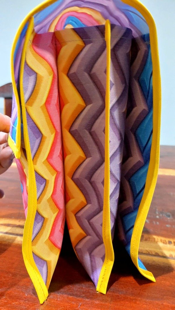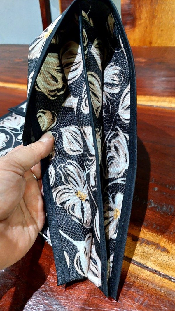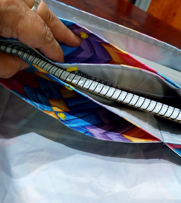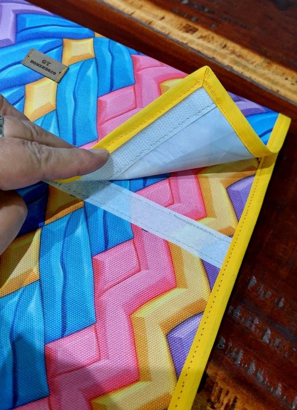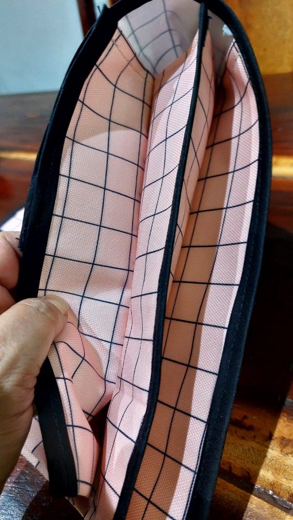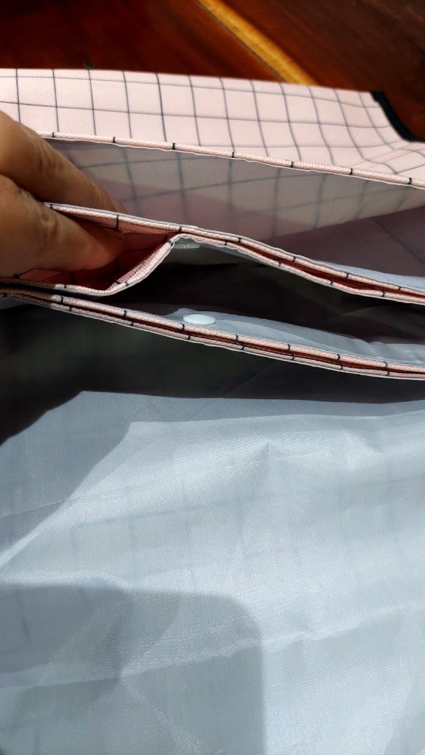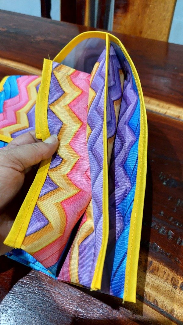Está confeccionada por nosotras en cordura exterior y silver interior, ambas telas impermeables, con terminaciones de cinta al bies.