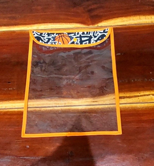Está confeccionada por nosotras en nylon cristal y cordura con terminaciones de cinta al bies.